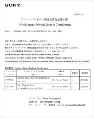 SONY環(huán)境品質(zhì)認(rèn)定通知書